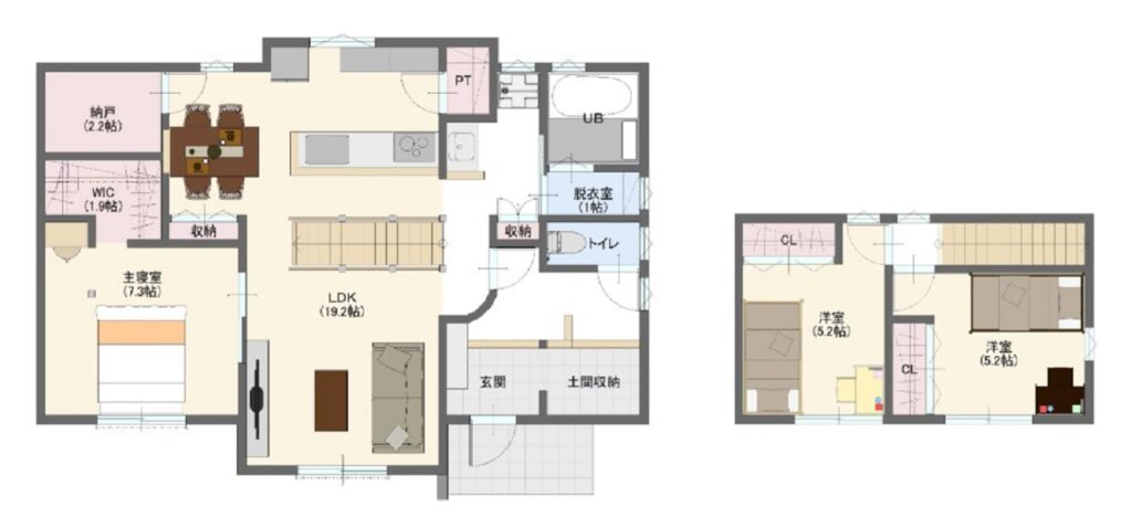 | 特徴 | ・1階にサービスルーム(多目的スペース)を配置 ・LDKは開放的な設計で家族が集まりやすい空間 ・各居室に十分な収納スペースを確保 |